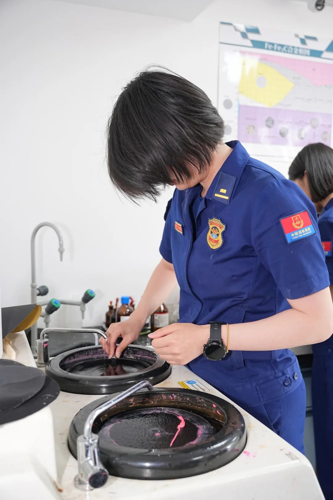 本次大赛旨在弘扬工匠精神、激发创新潜能。大赛赛制严格参照全国大学生金相技能大赛标准,设置检录处、制样室、金相观察室、保密室及评分室。评委们从操作规范、样品清洁程度、样品平整度、金相组织质量等方面,对选手的金相技能进行综合打分,确保了比赛的规范性与公平性。比赛现场,选手们屏息凝神、全力以赴,在短短30分钟内以毫米级精度完成试样制备,紧张有序地对纯铁金属样品开展预磨、抛光、浸蚀、显微镜观察等一系列复杂操作,最终制备出能够清晰呈现内部结构的金相样品。他们娴熟的操作手法与严谨的实验态度,充分展现出扎实的专业知识储备和精湛的实践操作能力。比赛期间,学院教学督导组组长陈爱平教授、全国火灾调查专家赵术学亲临现场观摩指导,并就如何做好“以赛促教、以赛促改、以赛促学”,提升人才培养质量提出指导意见。