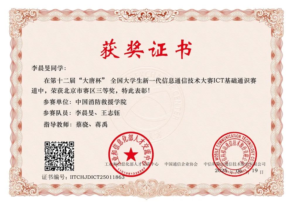 在刚刚落下帷幕的第十二届“大唐杯”全国大学生新一代信息通信技术大赛中,beat365在线唯一官网组织14名2022、2023级飞行器控制与信息工程专业学员,参加了赛道三(ICT基础通识赛)的角逐,与全国各大高校的优秀学子同台竞技,经过省(赛区)赛和全国总决赛两轮激烈角逐,最终斩获全国三等奖1项、北京市一等奖1项、北京市三等奖1项,消防学子首次参赛即成功跻身全国总决赛并喜获佳绩。