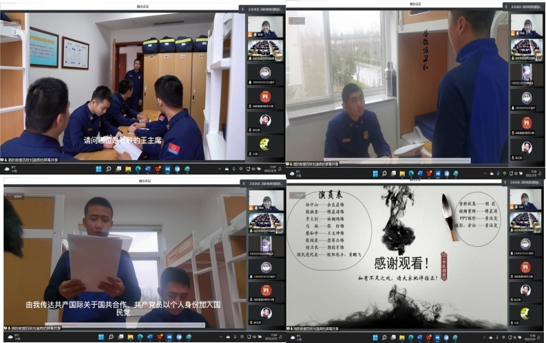 根据《中国近现代史纲要》课程教学安排,课前授课教员与课程负责人元彦梅主任请示沟通,明确线上教学实践可行性,制定实施方案、分解任务,充分调动学员的主观能动性。学员们开动脑筋、通力合作,利用课余时间围绕主题撰写方案、查找资料、制作课件、编排录制情景剧。课上,教员与学员虽身处“云端”,却摒弃时空的距离,紧密配合、互通有无,营造了良好的课堂氛围,圆满完成了第一次“云端”约会。课后,授课教员及时与学员沟通,了解学员的现场感受和知识获得感、满意度。学员们纷纷表示,虽然与教员身处不同空间,但却找回了久违的亲和力和现场感,收获颇丰。